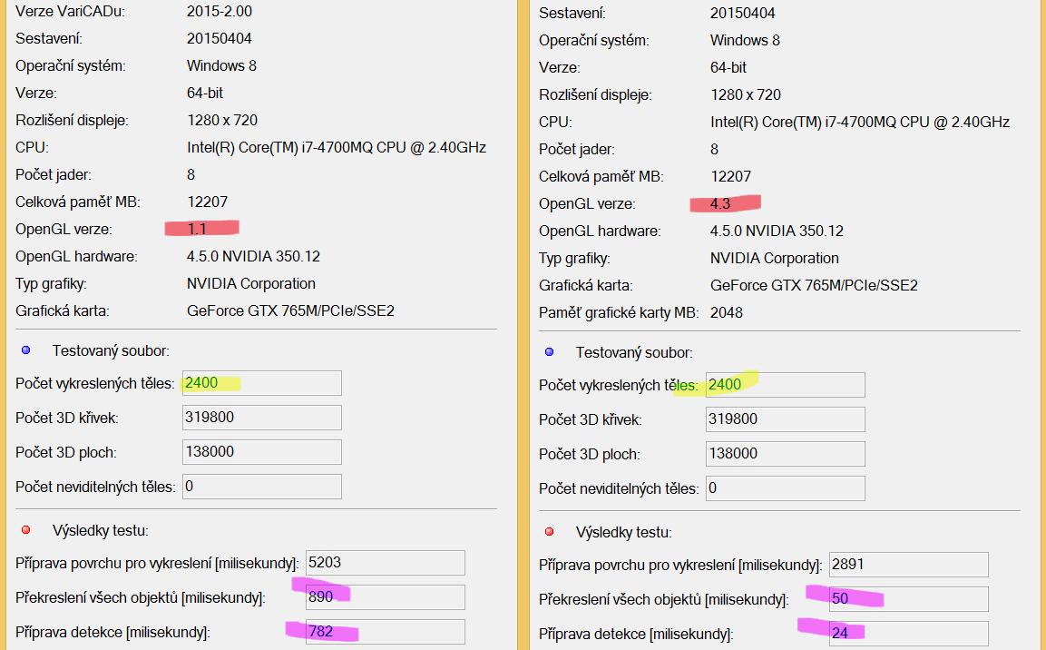 Výsledky testu VariCADu s OpenGL 1.1 a 4.3 na stejném PC: