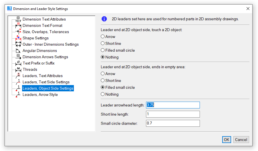 A alteração dos atributos das dimensões, permite a definição do dimensionamento de acordo com os vários standards de desenho, como DIN ou ANSI. Os atributos das dimensões, são usados também para os símbolos de acabamento ou setas de textos simples ou múltiplos.