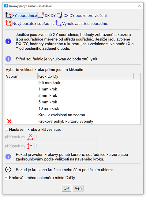 Výhodnější způsob, jak změnit nebo resetovat uživatelem definovaný střed souřadného systému je použít Krokový pohyb kurzoru a vybrat z dialogového panelu.